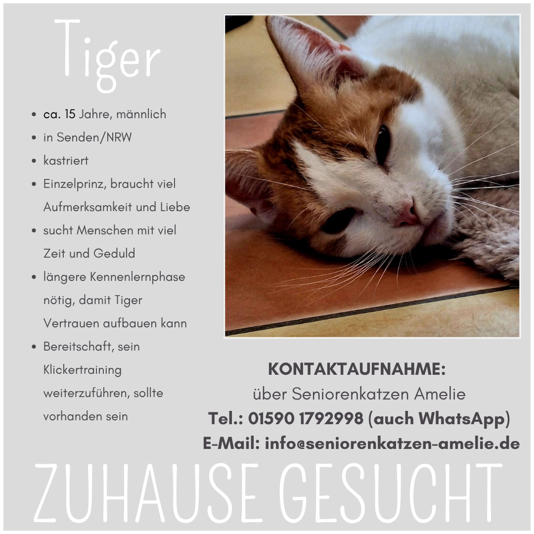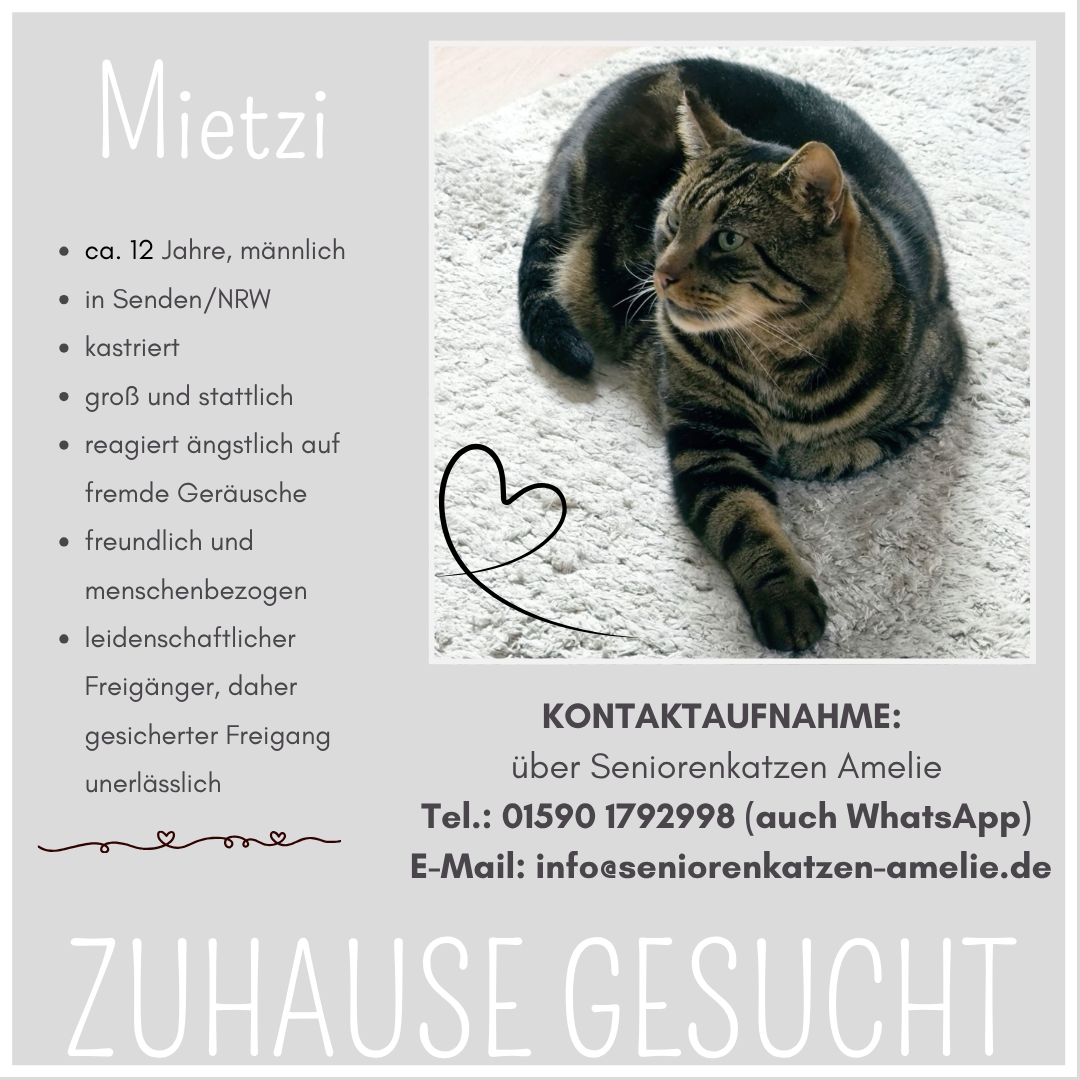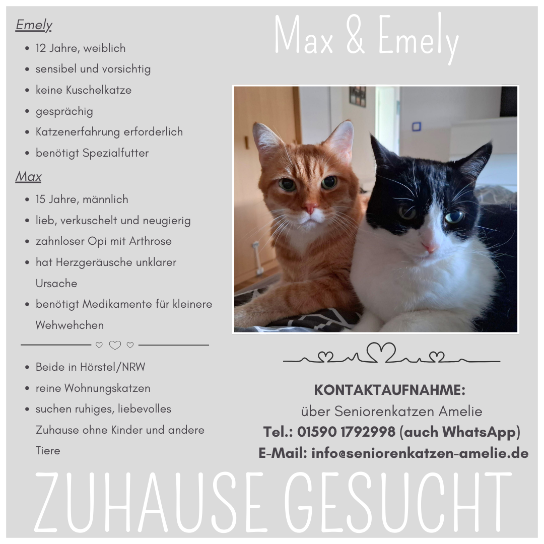 Für ausführliche Informationen zu unseren liebenswerten Seniorenkatzen und -katern bitte jeweils auf das Bild klicken oder besuchen Sie unsere Accounts für den gesamten Überblick: